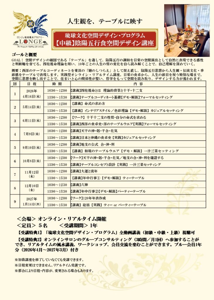時間割:午前:陰陽五行・時間学講義/午後:テーブルコーディネート・膳のしつらえレッスン
