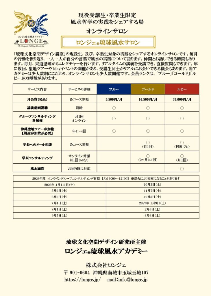 ロンジェ®琉球風水アカデミーでは、毎月の講義・対話・動画講座を通じて、東洋思想・空間文化を深めるためのサロンも運営しています。